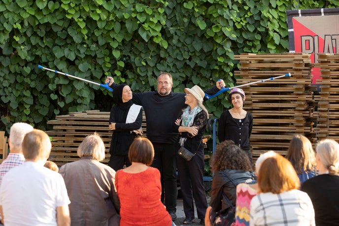 Beim ‚Theater am Hauptplatz’ am 29.9. 2023 wurden Gegenwart und Zukunft des Andritzer Hauptplatzes kurzweilig und pointiert dargestellt. Rund 60 Personen waren an einem lauen Spätsommerabend bei dieser Aufführung dabei. Abschließend wurde auch die Meinung des Publikums zu einzelnen der präsentierten Themen eingeholt.